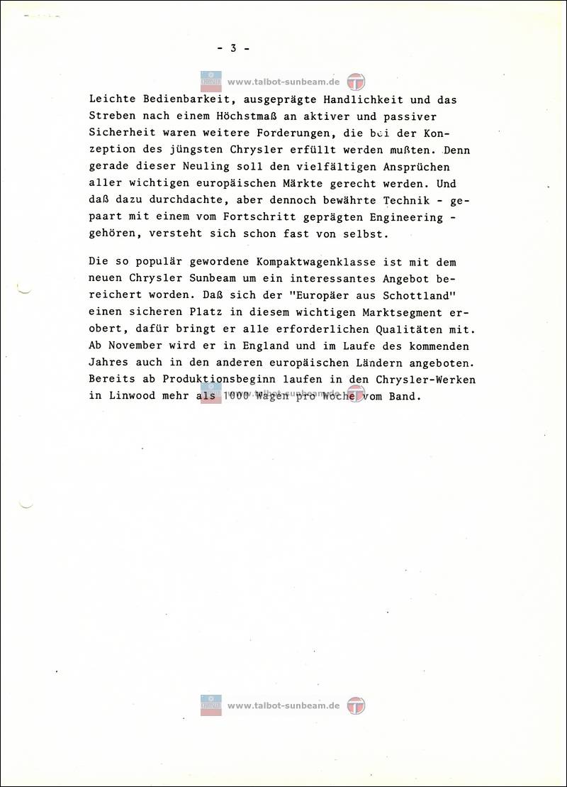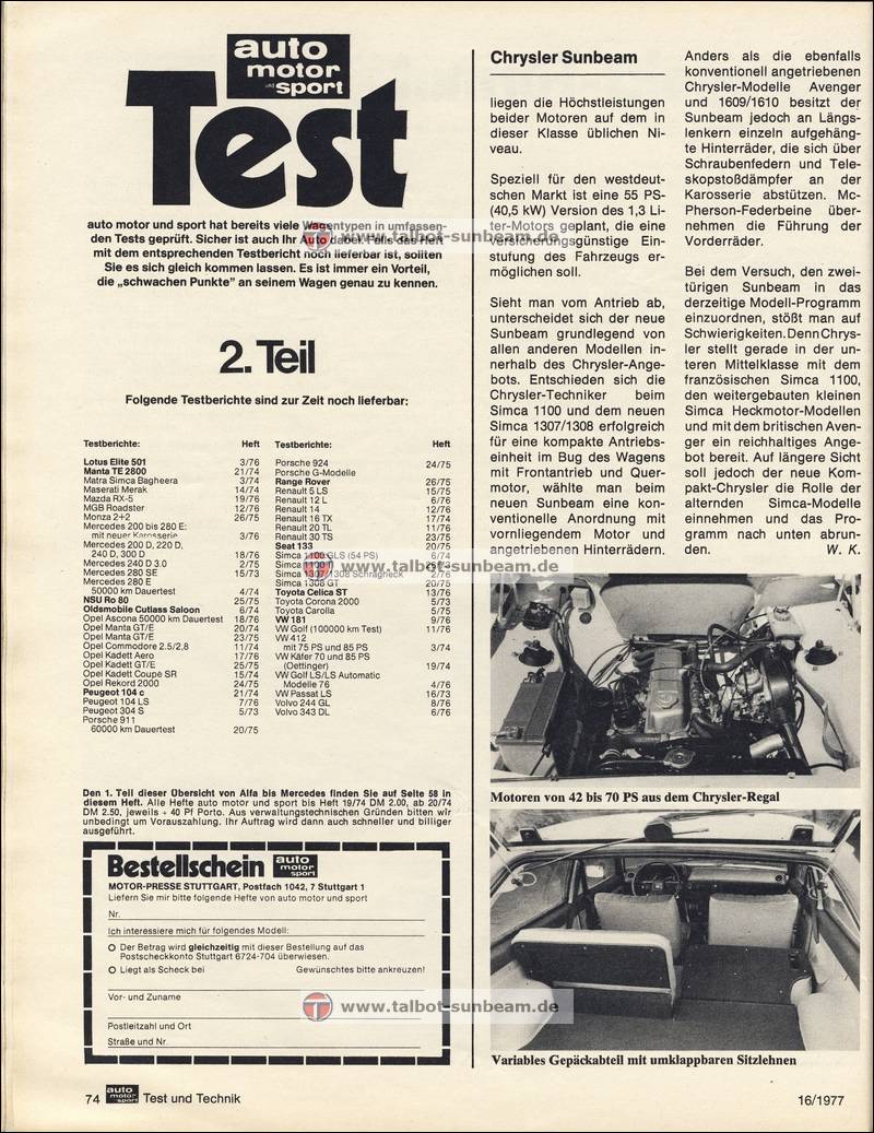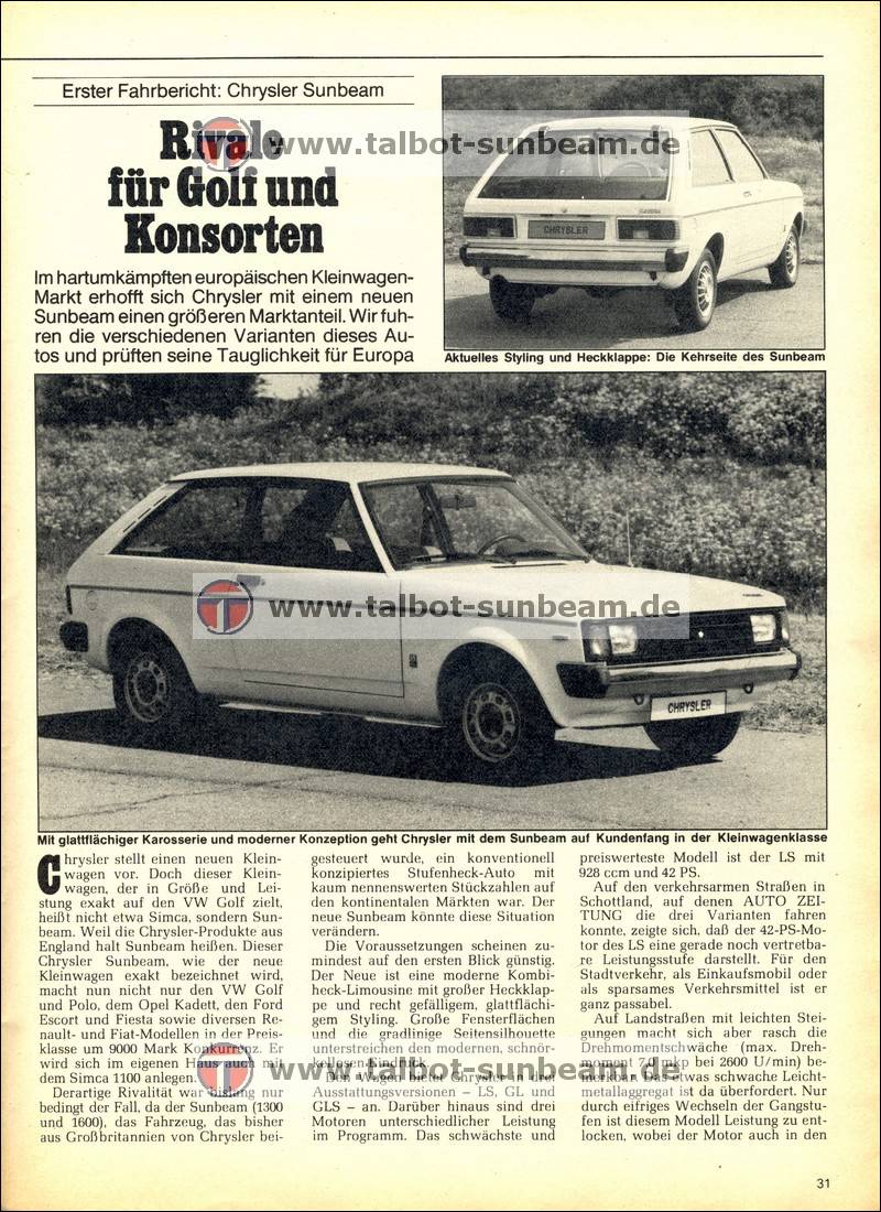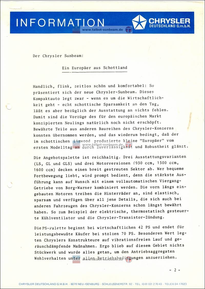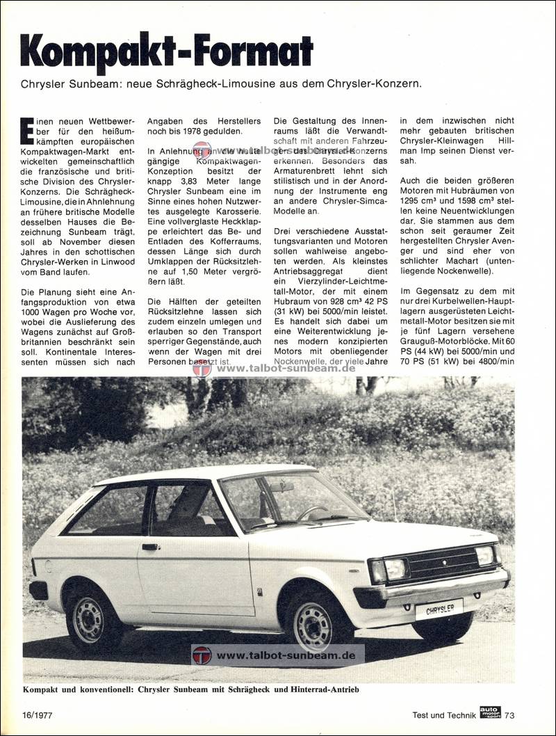 Information Chrysler Deutschland 1977 zur Sunbeam Einführung / Launch Information Chrysler Germany 1977